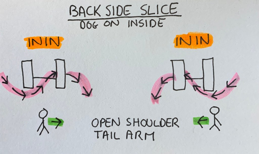 ININ – Backside Threadle Slice – The dog goes to the back side of the jump and turns away from you to take it as a slice. The dog is between you and the jump.
