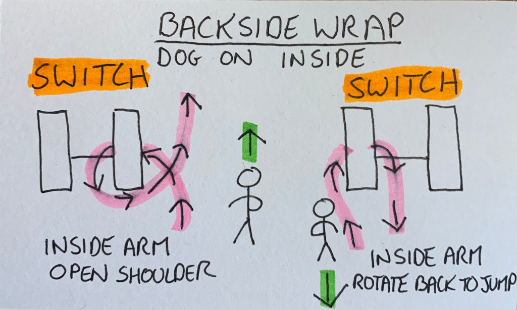 SWITCH – Backside Threadle Wrap. The dog is between you and the jump and turns away from you to take the backside of the jump and wrap the wing.